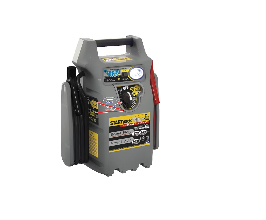 Das Starthilfegerät STARTPACK TRUCK 12/24 V von Gys ist mit zwei integrierten Hochleistungs-Bleibatterien ausgestattet und eignet sich ideal zum Starten verschiedenster Fahrzeuge, darunter LKW und Busse.