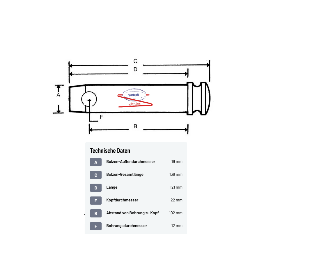 Präzisionsgefertigter Bolzen mit 19mm Außendurchmesser und 102mm Abstand von Bohrung zu Kopf. Entspricht Kategorie 1 Spezifikationen mit 138mm Gesamtlänge. Robuste Konstruktion mit 22mm Kopfdurchmesser und 12mm Bohrungsdurchmesser für zuverlässige Verbindungen in landwirtschaftlichen Anwendungen.