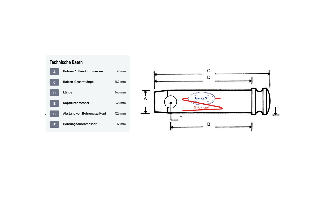 Präzisionsgefertigter Bolzen mit 32mm Außendurchmesser für Kategorie 3 Anbaugeräte. Mit 162mm Gesamtlänge und 125mm Abstand von Bohrung zu Kopf bietet dieser robuste Bolzen optimale Verbindungssicherheit.