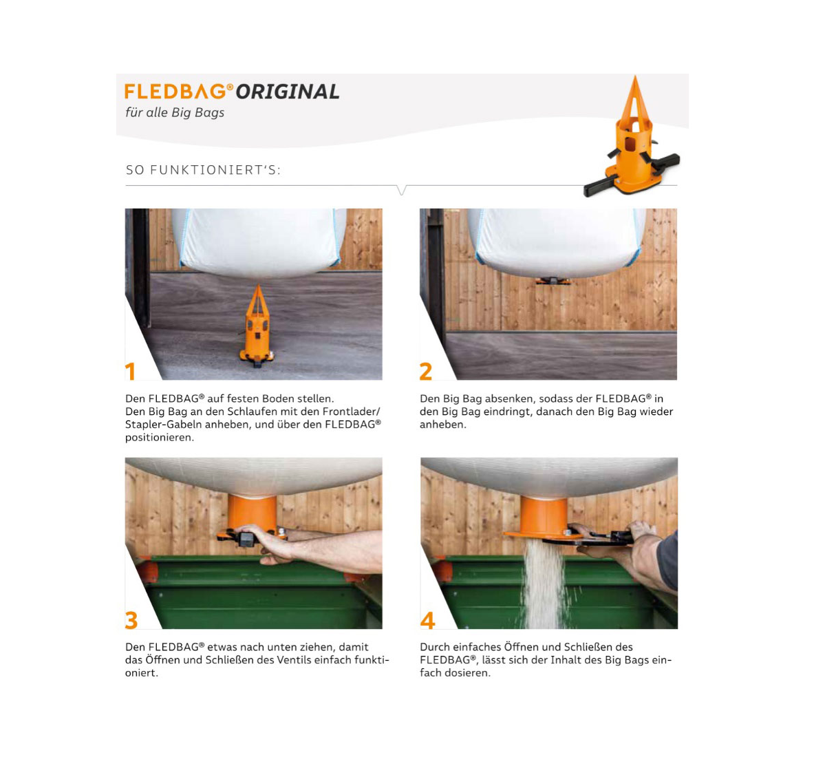 FLEDBAG® Original - standsicher + stabil. Mit dem innovativen FLEDBAG® können Sie Inhalte von Big Bags einfach, schnell und präzise entleeren. Etwaige Restmengen können dadurch im Big Bag für den nächsten Streueinsatz verbleiben.
