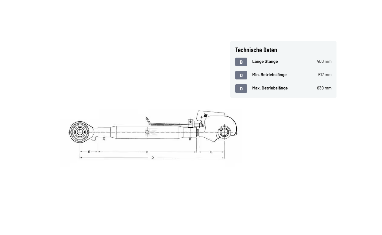 Marke Kramp bietet mit Oberlenker Auge/Haken 400, M36 Kat.3/3 ein hochwertiges Produkt für Schlepper bis 135 kW. Mit Fanghaken Kat.3 und 400 mm Stange bietet es einfache und sichere Verbindung zwischen Traktor und Maschine. Konstruiert für eine Mindestbetriebslänge von 617 mm und einer maximalen Länge von 830 mm.