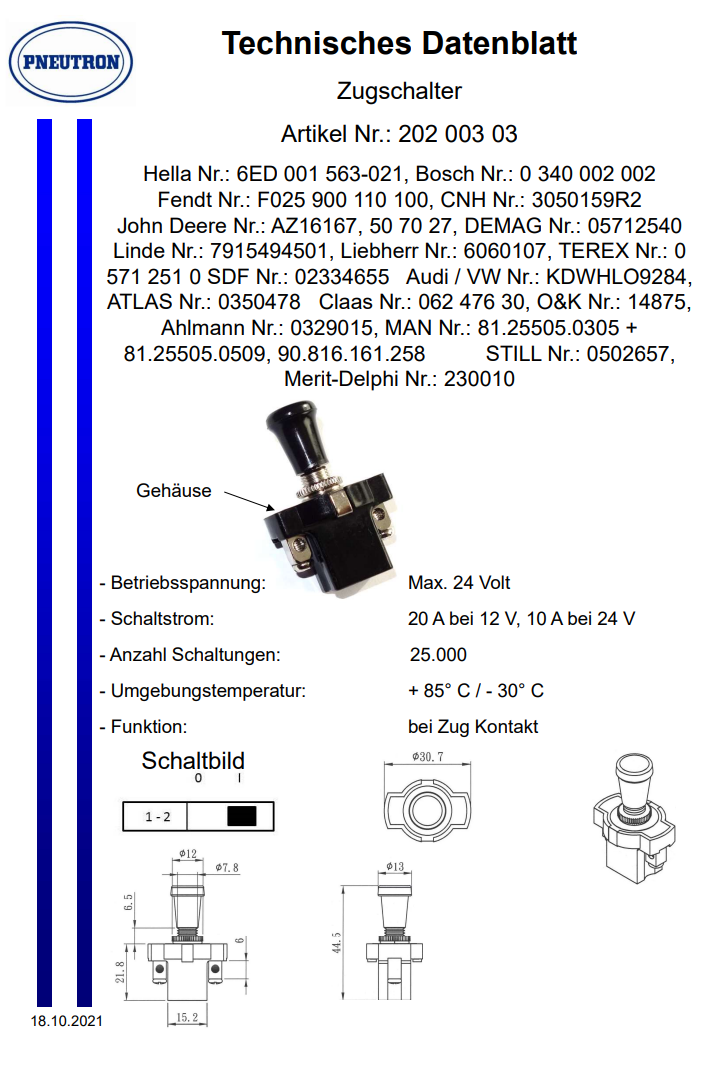Hochwertiger Zugschalter (EL230010) von Pneutron für landwirtschaftliche Fahrzeuge.